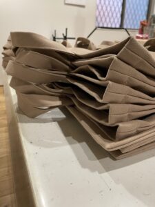今回は、ご注文いただいたバッグの細かいパーツを一つ一つ手作業で製作しています。まずは生地の裁断から始まり、仕様書と照らし合わせながらパーツの配置を確認。持ち手の長さや縫い位置、補強テープの通し方など、後工程に影響する部分ほど慎重にチェックします。写真に写っているように、同じ形状のパーツでも微妙な個体差が出ないよう、重ね方や向きにも気を配っています。
